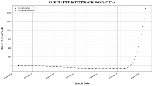 Example of cumulative seasonal flux interpolation plot generated by the DASIG-GWP module (CH₄-C shown as a representative gas).